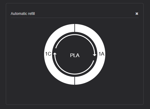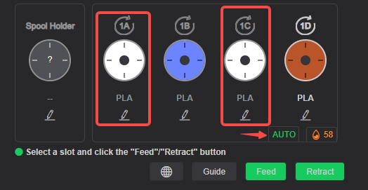 When "Auto feeding system" is enabled in the settings, if multiple slots contain filaments with identical parameters, CFS will automatically switch to another available spool once the current one is depleted. Click the "AUTO" button to view currently detected spools eligible for automatic switching.