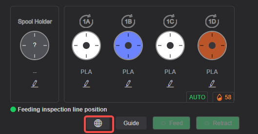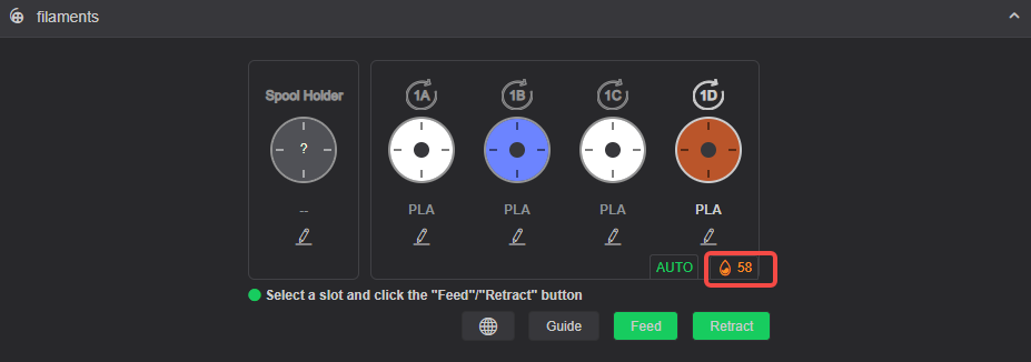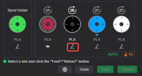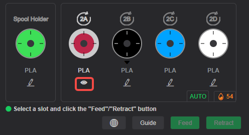 After selecting the filament slot you want to feed or retract, click the "Feed" or "Retract" button. Wait for the filament to be fully feed or retract. The button will become inactive once the process is complete.