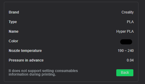 Click the Details icon to view additional filament information such as brand, material type, color, nozzle temperature range, and pressure in advance.