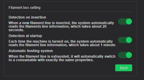 Click the Settings button to access the Filament box setting. You can configure options such as automatic filament line information reading and auto filament feeding.