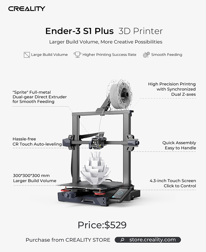 Creality, a global 3D printing pioneer and creator of several market-hit products, has recently launched Ender-3 S1 Plus, the latest innovative addition to its flagship Ender-3 S1 series. Compared to the previous editions, Ender-3 S1 and Ender-3 S1 Pro, Ender-3 S1 Plus has the largest build volume in the fleet. With a print speed up to 150 mm/s, Ender-3 S1 Plus has triggered vivid discussions and favorable reviews in the 3D printing community since its debut in June.