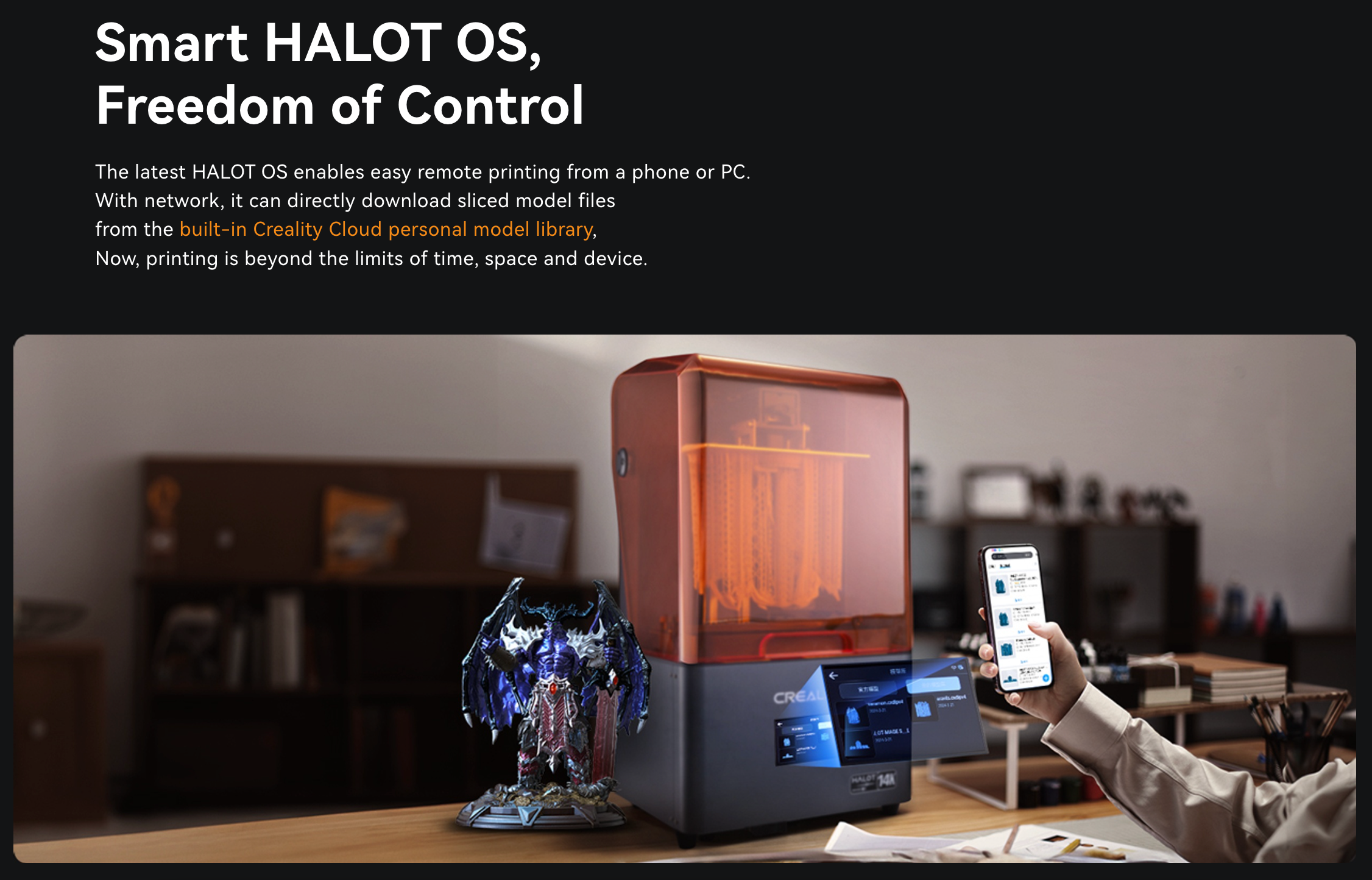 Equipped with the intelligent HALOT OS operating system, the HALOT-MAGE S delivers unparalleled convenience and connectivity. Seamlessly compatible with smartphones, tablets, and computers, this innovative system facilitates remote printing and collaboration across multiple devices. Furthermore, integration with the Creality Cloud enables direct access to a vast repository of model slice files, streamlining the printing workflow. Complemented by the HALOT BOX slicing software, renowned for its high adaptability and user-friendly interface, the HALOT-MAGE S offers an intuitive and efficient printing experience.