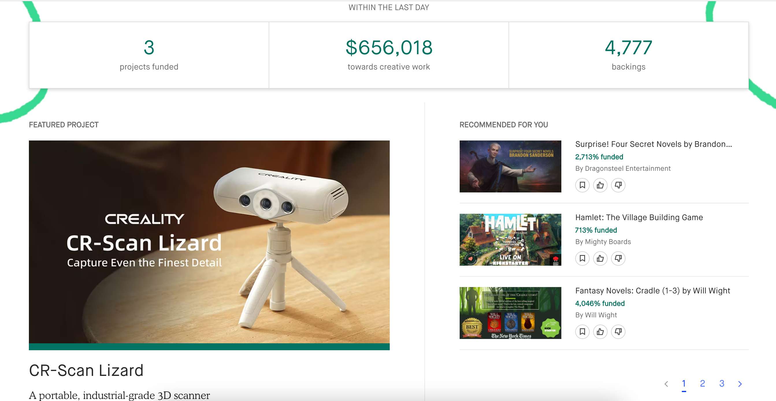 CR-Scan Lizard is placed on the first page on Kickstarter.