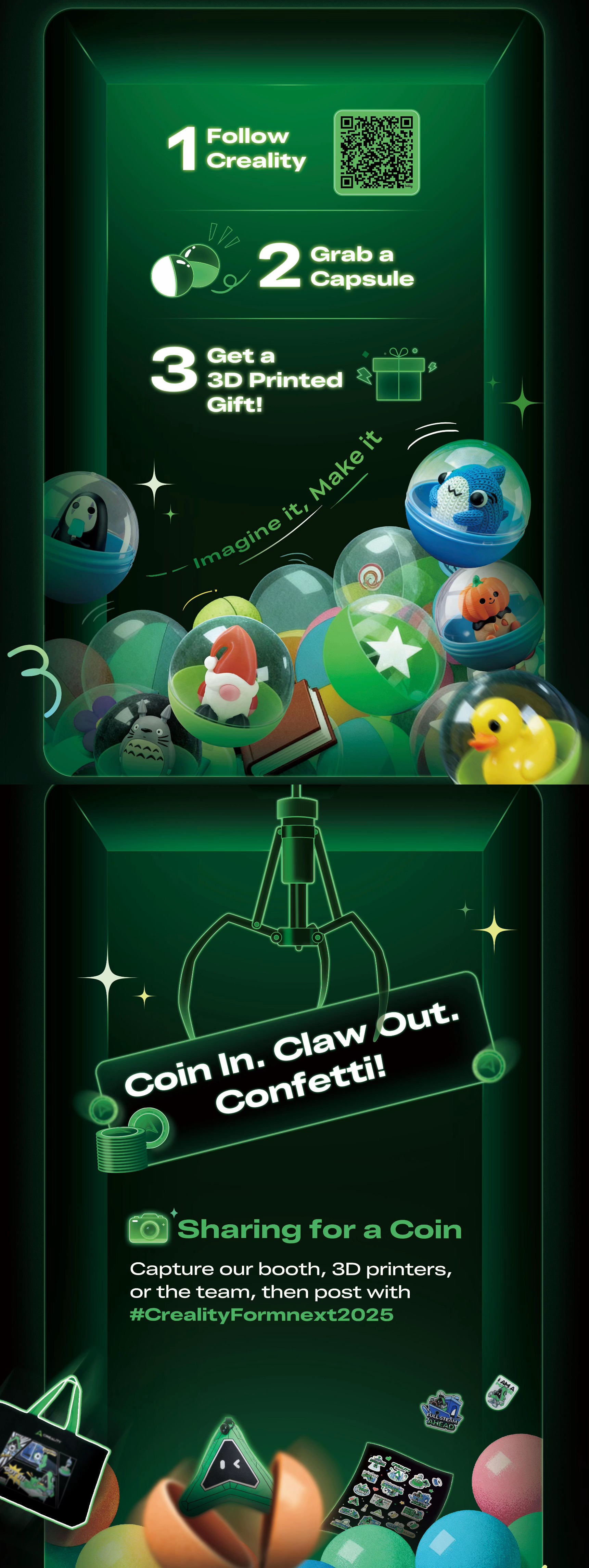 Step up to Creality’s Play & Win zone and try your luck! Our booth will feature claw machines and capsule machines, offering interactive excitement for every visitor. Participate and you could take home exclusive prizes, making your visit even more memorable.