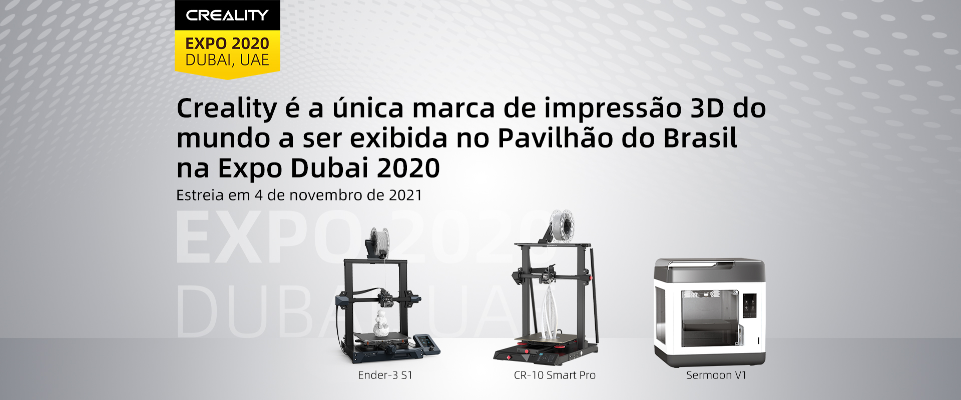 O fabricante chinês de impressoras 3D Creality 3D (Creality) apresentará suas últimas ofertas no Pavilhão do Brasil na Expo Dubai 2020 em 4 de novembro de 2021 como a única marca de impressão 3D a ter sido convidada por um pavilhão de exposições nacional. É a primeira vez que a marca de impressão 3D entra para o governo brasileiro no cenário internacional.