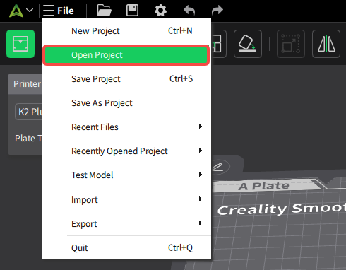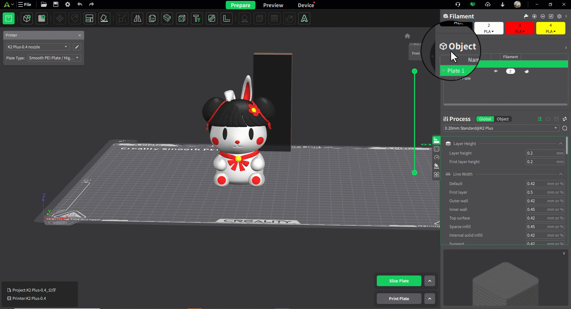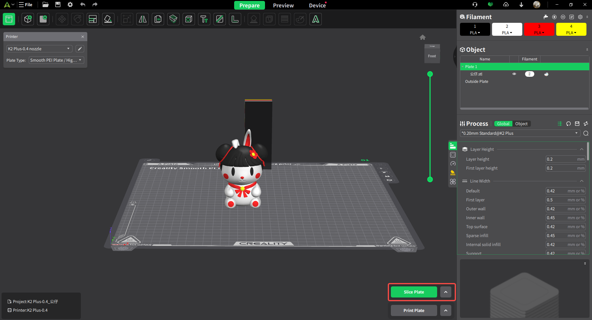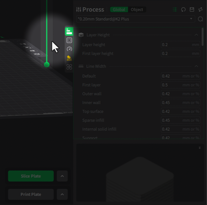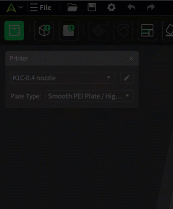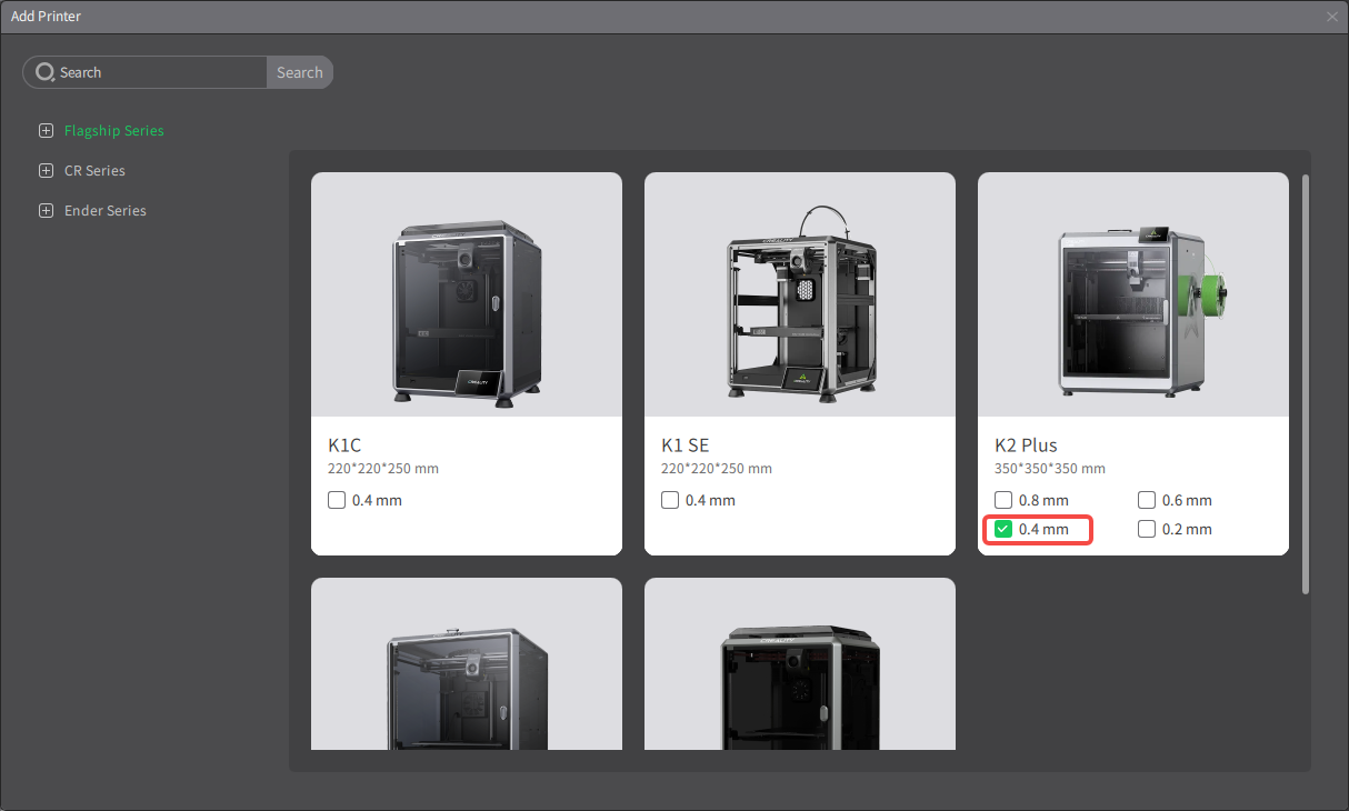 In the software, select your printer model and nozzle diameter. For K2Plus, the default nozzle diameter is 0.4mm.