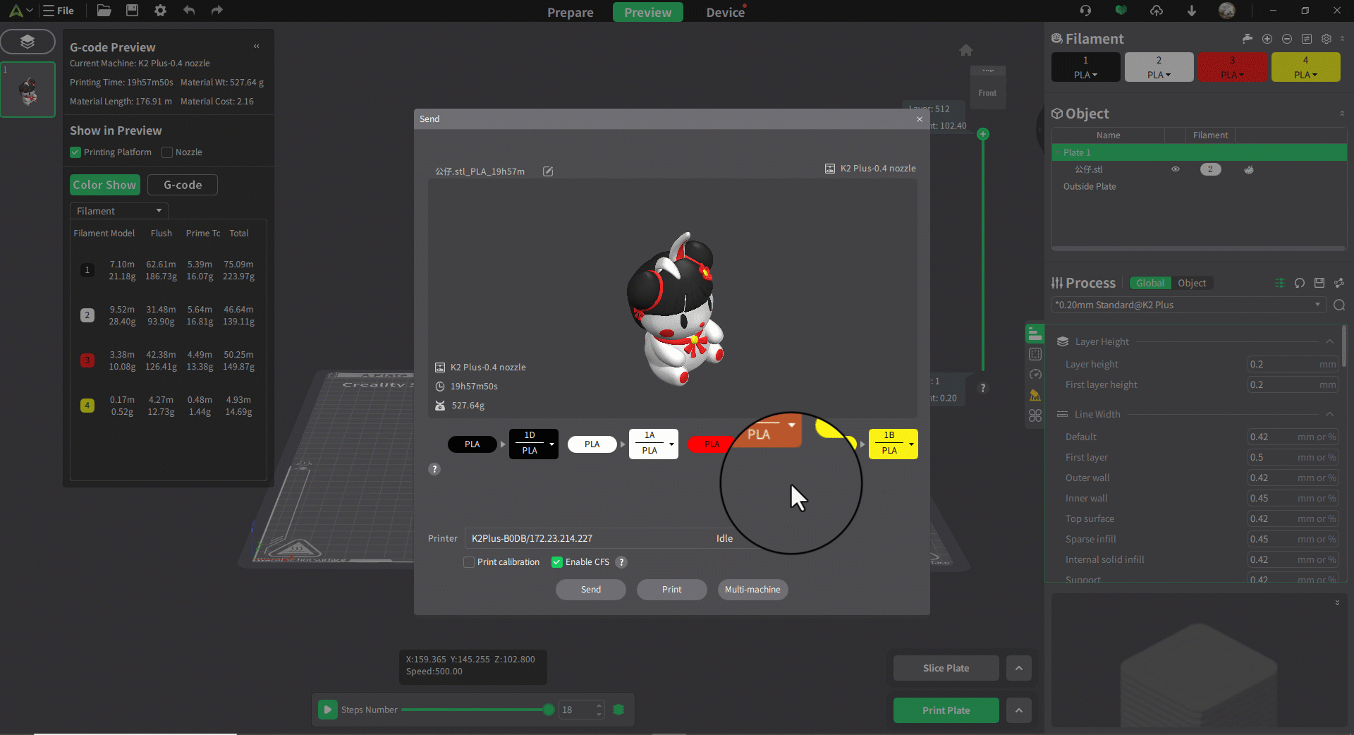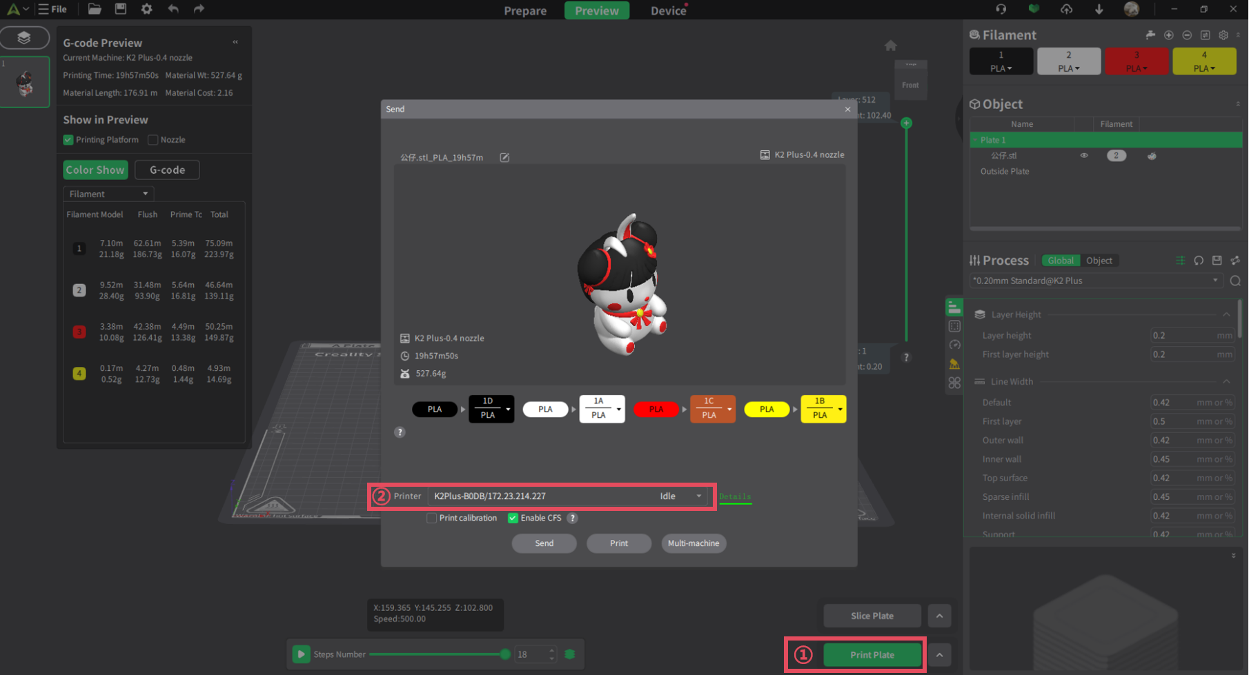 When printing with CFS, the filament used in the project file may not exactly match the filament available on your printer. When sending a print job, the system will automatically match the colors and filament types (such as PLA, ABS, PC, etc.) from the project file with the filament in CFS.
