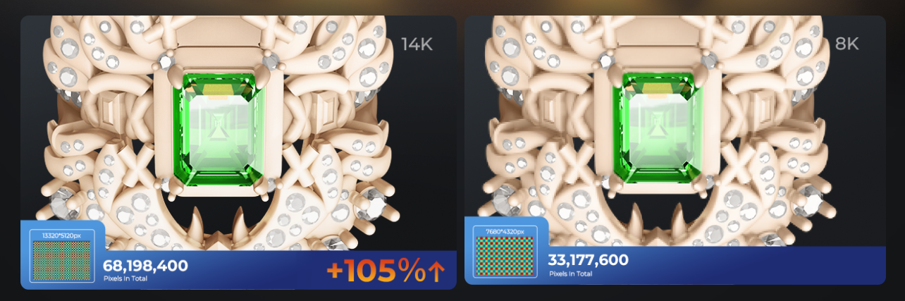 HALOT-MAGE Sは、わずか16.8×24.8μmの画素サイズを誇る画期的な14K超高精細プリントスクリーンを導入しています。13320×5120ピクセルの高解像度で、フィギュアやジュエリーの細部まで精細に再現します。さらに、10.1インチという十分大きな造形サイズで、最大223×126×230mmサイズのモデルを印刷することができ、さまざまな作業に十分な余地を提供します。